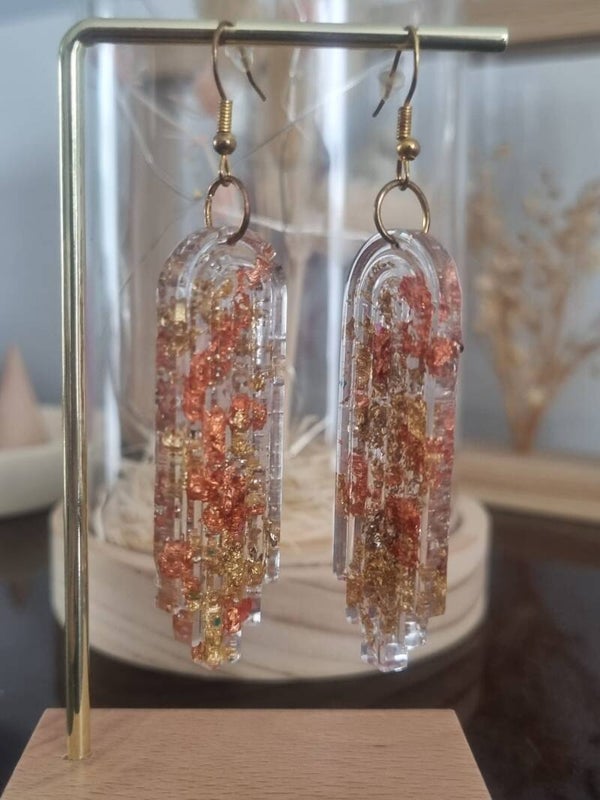 Ajoutez une touche d'élégance à votre tenue avec ces boucles d'oreilles en résine dorée. Leur design unique et brillant capte la lumière pour un effet éblouissant en toute occasion. Légères et confortables, elles sont parfaites pour un look sophistiqué au quotidien.
