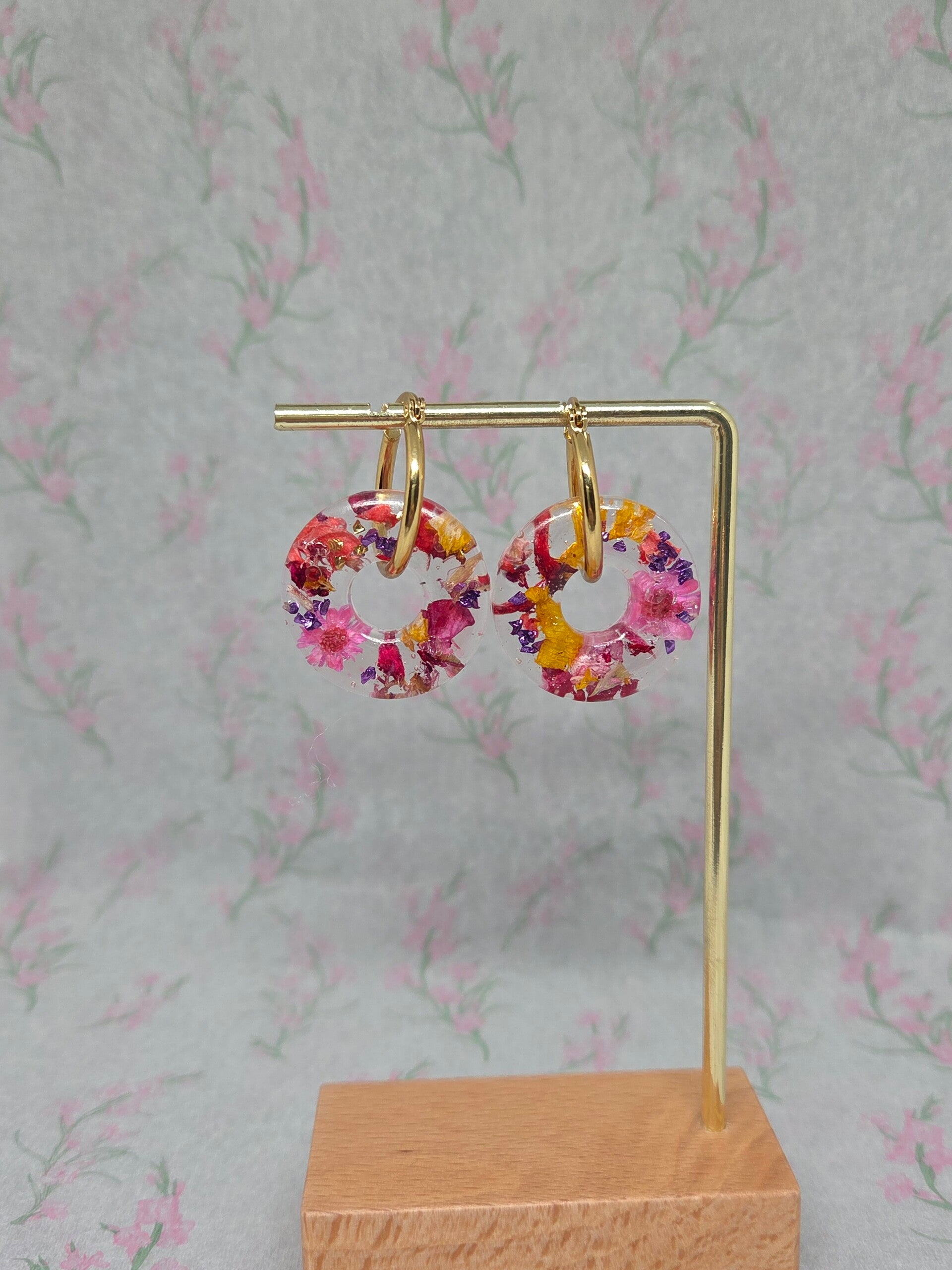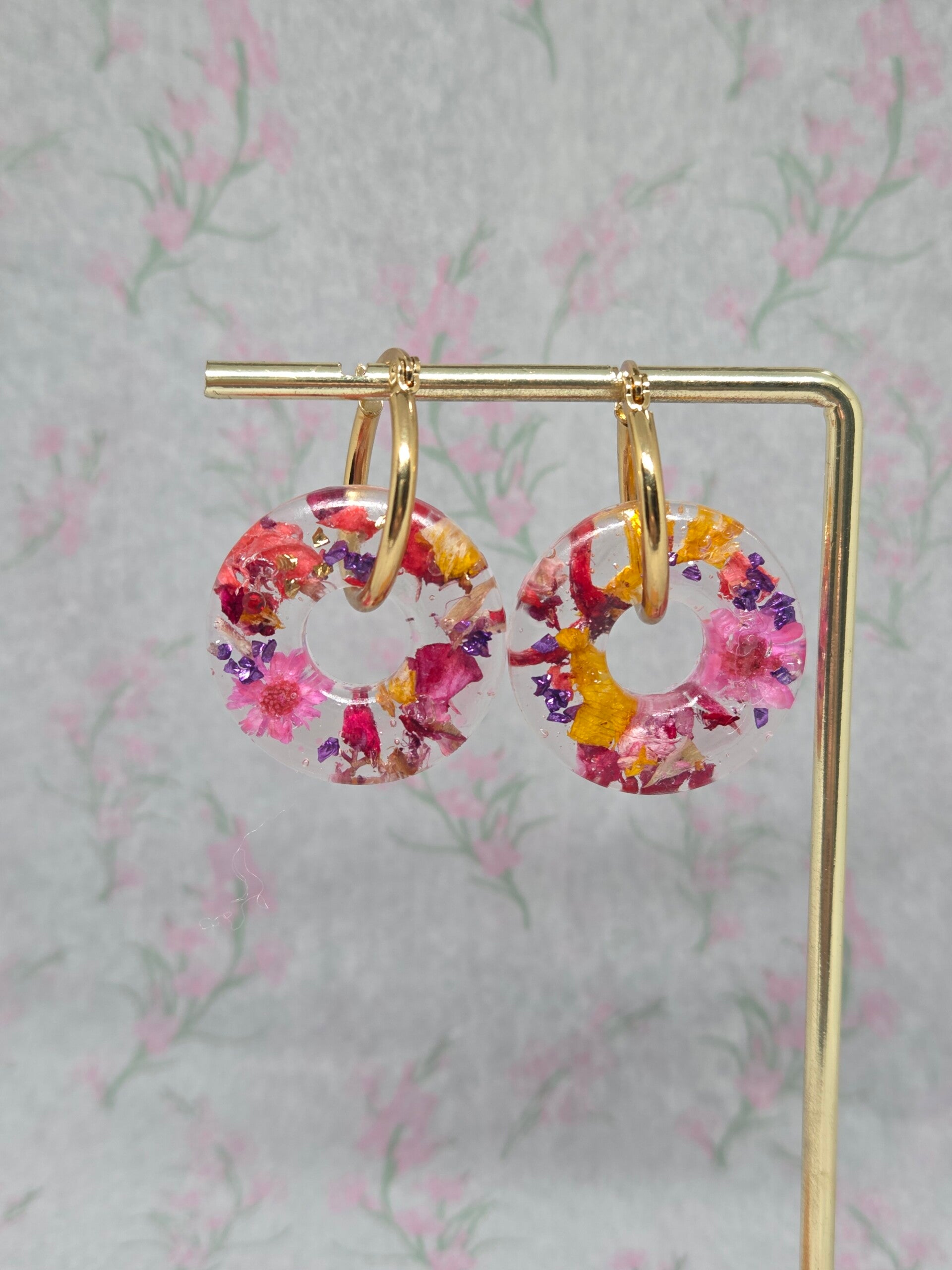 Les boucles d’oreilles Louise séduisent par leur design délicat et poétique. Leurs médaillons transparents, parsemés d’inclusions florales colorées, capturent la lumière et apportent une touche fraîche et féminine.
