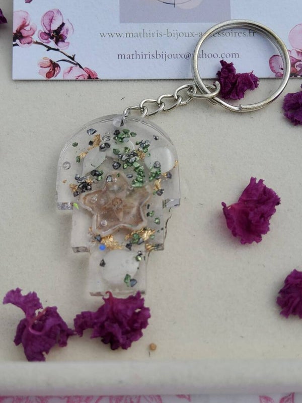 Eden – Porte-clés porte-bonheurEn résine transparente incrustée de fleurs naturelles, éclats dorés et verts.Un accessoire unique qui mêle élégance et originalité.