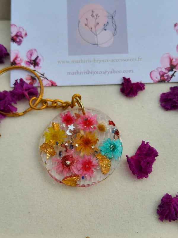 Capucine – Porte-clés fleuriRond en résine transparente parsemé de fleurs naturelles multicolores et éclats dorés.Un accessoire lumineux qui apporte de la bonne humeur partout avec vous.