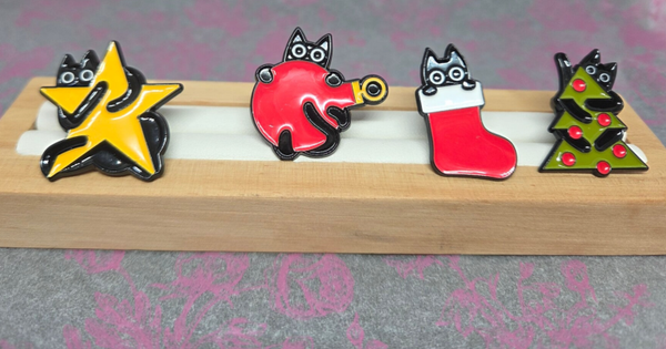Un petit chat espiègle caché dans un sapin décoré de boules rouges. Un pin’s plein d’humour et d’esprit de Noël, parfait pour ajouter une note joyeuse à ton look hivernal.