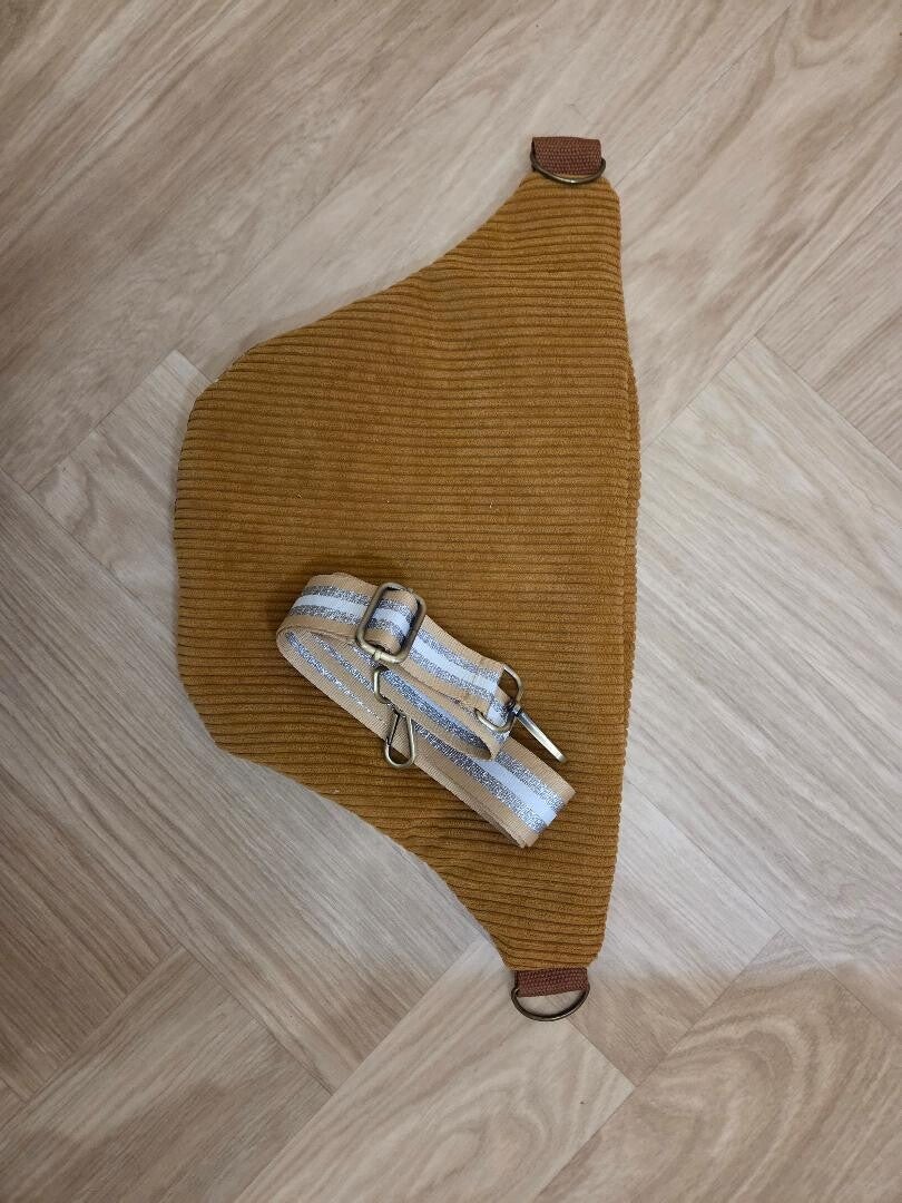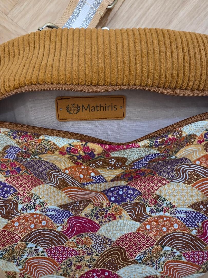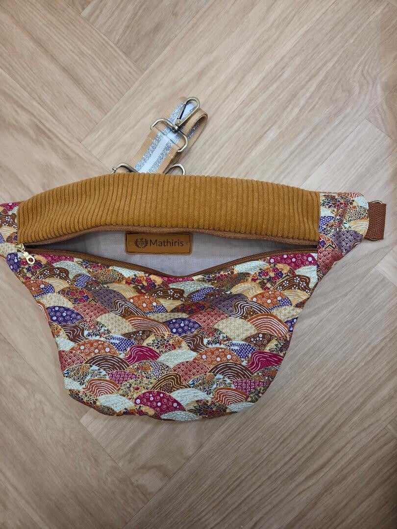 La banane Momiji est fabriquée à la main, avec soin et attention aux détails. Elle associe un velours côtelé camel doux et texturé à un tissu aux motifs d’inspiration japonaise, riche en couleurs et en finesse.